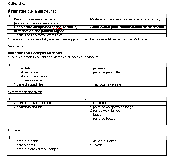 C’est une liste qui décrit les vêtements adéquats en quantité suffisante. Cette liste énumère aussi tout ce que les participants et participantes ont besoin pour le séjour au camp. Elle comporte aussi la fiche de santé dûment remplie ou corrigée, l’autorisation de camper de la part des parents et d’avoir en sa possession sa carte d’assurance maladie. Elle demande aussi les médicaments que l’enfant pourrait avoir besoin en quantité suffisante avec la posologie claire et précise. |